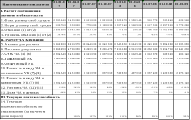 Фактический размер свободных активов, рассчитанный в соответствии с инструкцией о порядке расчета нормативного соотношения активов и обязательств страховщика, утвержденной приказом Федеральной службы России по надзору за страховой деятельностью №02-02/16 от 19.06.96 г., составляет на 01.01.2007 г. – 2 595 240 рублей, на 01.01.2008 г. – 1 821 860 рублей и на 01.01.2002 г. – 535 840 рублей. В 2007 году это превышает нормативный размер (превышение иначе можно назвать запасом платежеспособности), в 2008 году фактический размер свободных средств меньше нормативного.