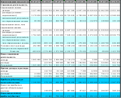 По страхованию иному, чем страхование жизни в 2007 году доходы составили 6 697 тыс. руб., в 2008 году уже 21 573 тыс. руб. Рост доходов – 320%. Расходы составили 7 029 тыс. руб. и 20 937 тыс. руб. Таким образом, в 2007 году по этим видам страхования был убыток 332 тыс. руб., в 2008 году прибыль – 636 тыс. руб.
