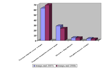 В январе-мае 2008 г. по сравнению с соответствующим периодом прошлого года опережающими темпами продолжал расти экспорт топливно-энергетических товаров на 164%, что повлекло увеличение доли этих товаров в структуре экспорта — более 69% и снижение доли других групп товаров, несмотря на значительные темпы их роста (рис. 1, 2).