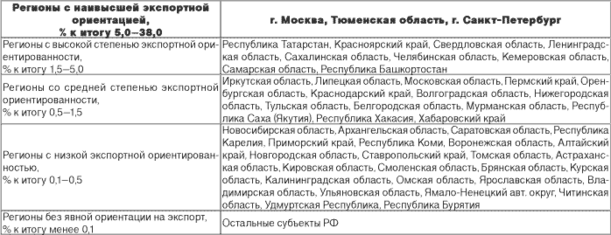 Таблица 1.Группы субъектов РФ по степени экспортной ориентированности