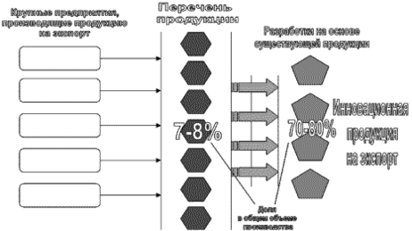 Данный подход, рассматривает возможность качественного изменения продукции предлагаемой предприятиями на экспорт, которое будет осуществляться на базе инновационных преобразований экспортируемых сегодня видов продукции. Поэтому необходима структура, которая сможет претворить в жизнь предлагаемый механизм совершенствования экспортного потенциала.