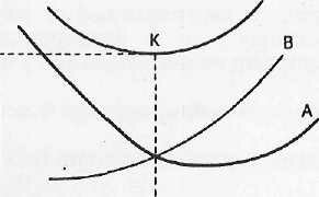 На рисунке 1 показана зависимость внутрипроизводственных затрат (А), внепроизводственных (В) и полных затрат (П = А + В) от объема выпускаемой продукции. Оптимальный размер предприятия достигается при минимуме полных затрат на выпуск продукции. На рисунке этот минимум обозначен точкой К.