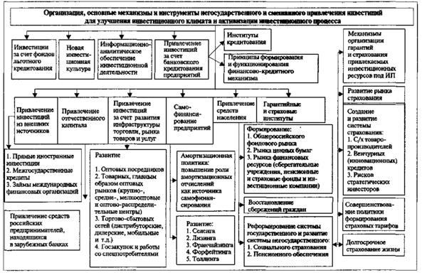 На схеме (рис.2) показана модель организации инвестиционного процесса в рыночной экономике. Это сложная система взаимодействия различных участников инвестиционного процесса, в ней отражены основные возможные источники привлечения инвестиций в экономику. Развитие и совершенствование этих направлений в совокупности приводит к улучшению инвестиционного климата в стране.
