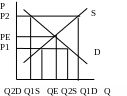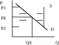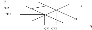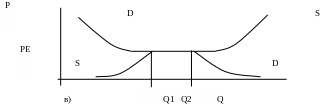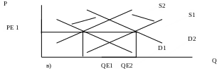 На рис.2.3 в) кривые спроса и предложения также имеют общий отрезок: в этом случае равновесие устанавливается при любом объеме в интервале от Q1 до Q2 и равновесной цене PE. Изменение объема в этом интервале не вызывает изменения цены спроса и равной ей цене предложения.