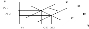 Предположим, что объем предложения возрастает. Значит, возрастает спрос на данный товар. Дефицит QE1QE2 продукта Q при цене PE 1 повысит цену до PE 2 в результате установится новое равновесие в точке E2 .