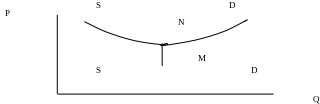 На рис.2.3 б) представлен случай, когда кривые спроса и предложения совпадают в отрезке NM. Равновесие на рынке достигается при любой цене в диапазоне от P1 до P2 и равновесном объеме QE. Изменение цены в указанном диапазоне недостаточно чувствительно, чтобы вызвать у потребителей изменение объема спроса, а у производителей – изменение объема предложения.