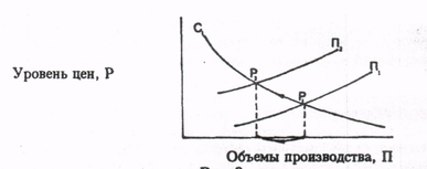 Цены двигаются от P1 к Р2. Здесь действует уже кривая совокупного предложения, вернее ее перемещение вверх. На кривой спроса мы обнаруживаем сокращение, отражающееся соответственно и на горизонтали реального объема производства. На него влияют не только произошедшее уже удорожание факторов производства, но и, что не менее важно, ожидаемое.