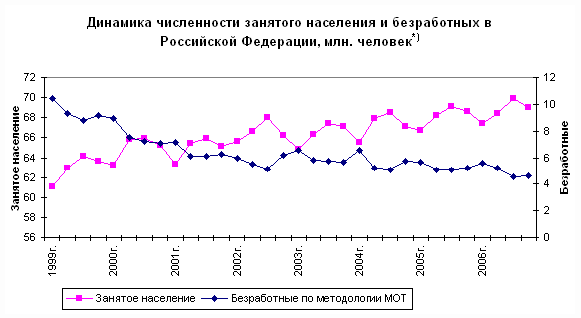 За содействием в трудоустройстве в органы службы занятости на конец 2006г. обратились 6,4 млн. человек, или 8,6% численности экономически активного населения. 3,3 млн. человек были признаны в установленном порядке безработными.