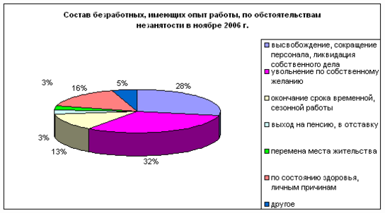 В общей численности безработных 31,8% не имели опыта трудовой деятельности. Среди безработных, имеющих опыт трудовой деятельности, 31,9% составляют лица, уволившиеся по собственному желанию, 28,1% - лица, которые оставили последнее место работы в связи с сокращением персонала.