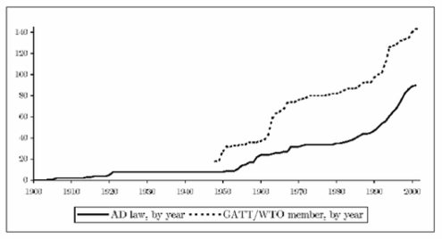 ВТО - еще один "двигатель" распространения АМЗ. Наибольшее внимание ВТО уделяет проблемам антидемпингового законодательства. При этом, хотя ВТО и не выдвигает формального требования принятия антидемпинговых законов, многие страны ощущают некоторое давление в сторону принятие подобных норм.13 Этого "неформального" давления вполне достаточно, чтобы сделать связь между расширением ВТО и принятием антидемпинговых законов достаточно значимой (Рисунок 2). Вполне вероятно, что большое количество стран, которые имеют антидемпинговые законы, но не применяют их, приняли их формально, "для ВТО". Склонность ВТО к рекомендациям по принятию антидемпинговых законов может быть объяснена письмом США в ВТО, где говорится, что антидемпинговые законы "помогают правительствам в их стремлении к продолжению либерализации торговли, предоставляя поддержку национальной промышленности, которая страдает от иностранных фирм, использующих нечестные торговые практики, даже в условиях либерализации внешней торговли. С этой точки зрения, антидемпинговые правила критически важны для получения и сохранения необходимой общественной поддержки общей многосторонней цели торговой либерализации... Хотя антидемпинговые правила содержат средства защиты против наносящего вред демпинга, это не потому, что эти практики ценообразования, т.е. демпинговые практики, антиконкурентны в антимонопольном смысле. Антидемпинговые правила обеспечивают защиту от наносящего вред демпинга в качестве косвенного ответа на нерыночную политику иностранных государств или различия в национальных экономических системах14".