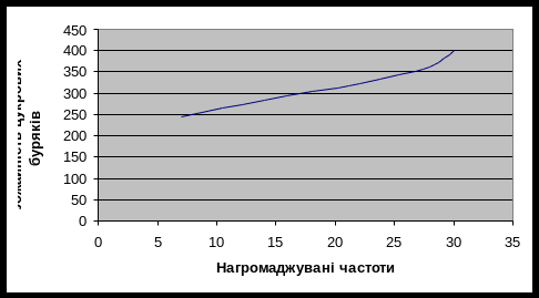 Рис. 4. Кумулята розподілу господарств за урожайністю цукрових буряків
