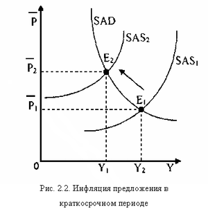 Причинами инфляции предложения выступают увеличение издержек производства (рост налогов, цен на факторы производства и т.д.).возникновение олигополистических или монополистических объединений со стороны продавцов, политика профсоюзов. На рисунке 2.2. отражена инфляция предложения в краткосрочном периоде.