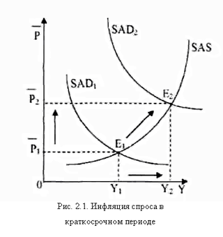 Причинами инфляции спроса выступают увеличение объема денежной массы, скорости обращения денег и платежных средств (различных чеков, векселей, иностранной валюты и пр.). На рисунке 2.1. отражена инфляция спроса в краткосрочном периоде.