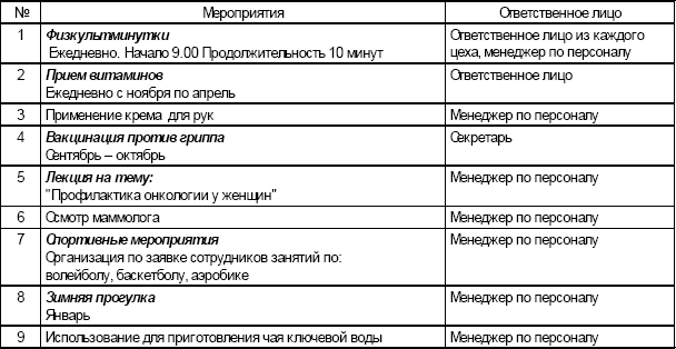скорректировать программу "Здоровье" (см. Таблицу 5) (компенсация стоимости лекарств для сотрудников, оплата санаторной путевки, стоматологическая помощь, доплата некурящим и т. д.), пакет социальных выплат и льгот (компенсация на питание, беспроцентные денежные кредиты, покупка сотрудниками для себя изделий предприятия по себестоимости и с рассрочкой платежа, скидка на покупку товаров фирмы родственниками и знакомыми и др.);