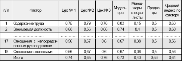 Согласно результатам, занесенным в таблицу 2, можно оценить не только средний индекс удовлетворенности по конкретному фактору, но и общий индекс удовлетворенности производственной ситуацией в конкретном цехе или группе сотрудников.