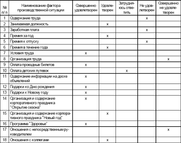 При составлении анкеты определяется перечень наиболее характерных показателей и критериев их оценки. При этом на каждом конкретном предприятии наряду с основными показателями производственной ситуации (содержание труда, заработная плата и др.) возможны специфические факторы мотивации (различные социальные программы и т. д.).