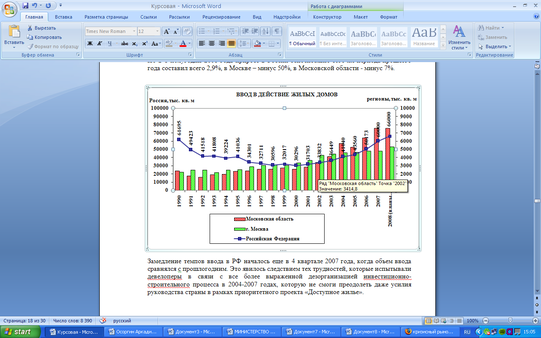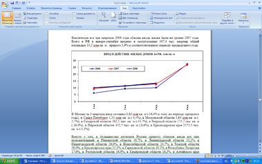 В последние 7 лет объемы ввода жилья в РФ и основных регионах уверенно росли. В 2006 году в РФ было введено 50,2 млн кв. м (прирост от предыдущего года 15%), в 2007 – 60,0 млн кв. м (прирост 20%). В 2008 году ожидался ввод 66,0 млн кв. м (прирост 10%).