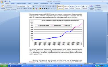 На рисунке приведены фактические данные по рынку жилья Москвы за январь-октябрь 2008 года. Отклонение прогноза от фактических значений за этот период не превышало 3,5%, что является достаточно хорошим показателем. Аналогичные результаты получены по 12 городам России.