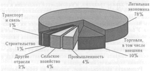 Переход к рынку сопровождался взрывным ростом теневой экономики. Рост теневой экономики был настолько значительным, что приблизительно в 1996 г. перекрыл сокращение ее легальной части. Теневой и легальный виды деятельности настолько переплелись, что их почти невозможно отличить друг от друга0.