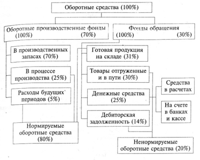 Общим в структуре оборотных средств различных предприятий и организаций является преобладание средств, размещённых в сфере производства. На их долю приходится более 70 всех оборотных средств.