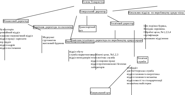 На рис.2.1 представлено організаційно-економічну структуру цукрового заводу ТОВ "Панда". Головним органом правління ТОВ "Панда" є Збори учасників Товариства, на засіданнях яких вирішуються усі управлінські та фінансові питання діяльності цукрового заводу.