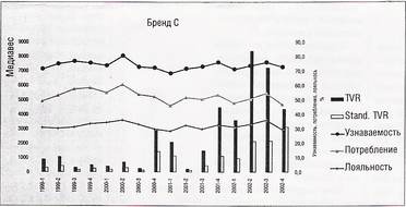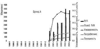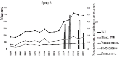В этой связи, однако, не стоит делать выводы о неэффективности рекламы. Можно предположить, что даже столь "мощный" бренд мог бы сдать свои позиции, не будь ТВ-поддержки. Резонный вопрос: почему же в период 1999 – 2001гг., когда медиаактивность марки была низкой, узнаваемость, потребление и лояльность оставались на том же предположительно максимально возможном уровне? Вспомним предыдущий пример. Может быть, причиной тому явилось упомянутое выше расширение рынка в данном товарном сегменте в целом? Следует признать, что без дополнительной информации утверждать, что-либо с уверенностью невозможно.