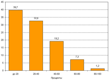 Теперь обратимся к показателю дефицита доходов, измеряемому в процентах от величины прожиточного минимума и указывающему на то, сколько нужно доплатить бедным для того, чтобы подтянуть их доход к величине прожиточного минимума, то есть, чтобы они перестали быть бедными. В среднем по всем бедным дефицит дохода составил 28,7%. Данный результат дает основания утверждать, что российская бедность неглубокая. Представленные на рисунке 2 данные иллюстрируют тот факт, что для большинства бедных семей дефицит дохода не превышает 20% от величины прожиточного минимума, и только у 8,5% он выше 60% прожиточного минимума.