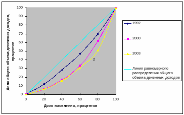 Неравенство в распределении общего объема денежных доходов между группами населения с различным уровнем материального достатка.
