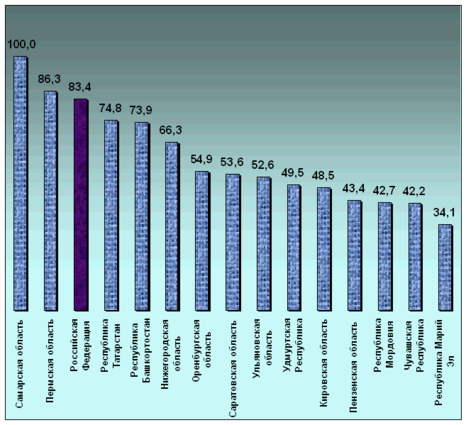 Рисунок Д.1 - Среднедушевые денежные доходы в Приволжском федеральном округе в процентах от величины среднедушевых денежных доходов в Самарской области (за сентябрь 2005 года).