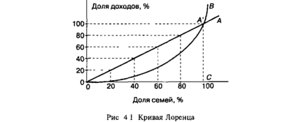Прямая линия ОА называется линией абсолютного равенства распределения доходов. Она отражает ситуацию, когда 20% людей принадлежат 20% доходов, 40% людей - 40% доходов и т.д. Кривая ОВ показывает долевое распределение доходов по группам семей в действительности.
