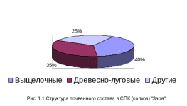 Современное воздействие рельефа и других факторов почвообразования обусловлено формированием на территории хозяйства большого разнообразия почв разных типов, но наибольшее распространение имеют черноземы выщелочные и древесно-луговые. Более наглядно структура типов почв в СПК (колхоз) «Заря» показана на диаграмме.