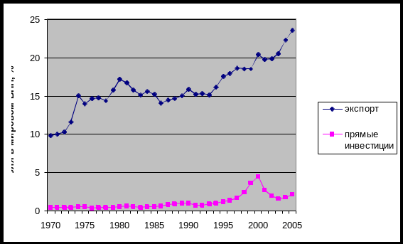 График 3. Доля прямых инвестиций и экспорта в мировом ВНП в 1970-2005 годы.