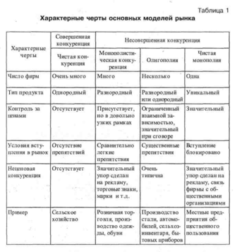 Обычно выделяют четыре типа рынка: совершенная (чистая) конкуренция, монополистическая конкуренция, олигополия, чистая монополия (табл. 1). Совершенная конкуренция и чистая монополия представляют собой «идеальные» (абстрактные) модели рыночных структур, которых в реальной практике не существует. Монополистическая конкуренция и олигополия характерны для большинства рынков.