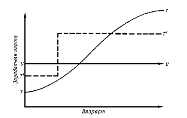 Подготовка оказывает серьезное влияние на характер взаимосвязи между заработками и возрастом. Предположим, что не прошедшие подготовку лица получают постоянный заработок независимо от возраста, как это показывает горизонтальная прямая UU на графике. Проходящие подготовку лица будут иметь более низкие заработки в течение периода подготовки, потому что в это время они осуществляют ее оплату, и более высокие заработки в старших возрастах за счет получаемого тогда дохода от подготовки. Совместное действие этих факторов – плата за подготовку и получение от нее доходов – будет вести к тому, что кривая изменения заработков с возрастом у прошедших подготовку (кривая ТТ на графике) окажется круче по сравнению с теми, кто ее не проходил. Различие будет тем сильнее, чем больше издержки инвестирования и отдача от них.
