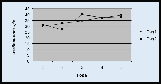 С помощью метода развития тенденции с помощью наименьших квадратов, смогла расчитать выровненную рентабельность продукции животноводства и показать графически, где значения составили: 2002 - 29,796%; 2003 - 32,198%; 2004 - 34,6%; 2005 - 37,002%; 2006 - 39,404%.