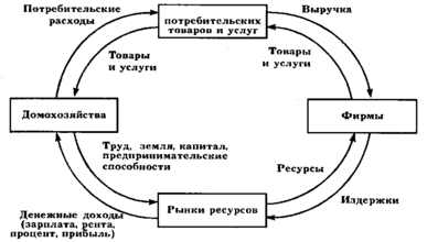 Кругооборот спроса и предложения может быть конкретизирован с учетом движения ресурсов, потребительских благ и доходов. Спрос домохозяйств выражается в расходах, осуществляемых на рынках потребительских товаров и услуг. Продажа этих товаров и услуг составляет выручку фирм. Покупка ресурсов, необходимых для этого, означает издержки фирмы. Домохозяйства, поставляя необходимые ресурсы (труд, землю, капитал, предпринимательские способности), получают денежные доходы (заработную плату, ренту, процент, прибыль). Таким образом, реальный поток экономических благ дополняется встречным денежным потоком доходов и расходов.