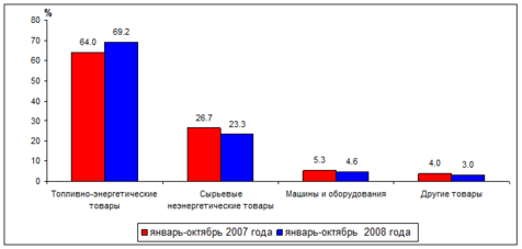В январе-октябре 2008 г. по сравнению с соответствующим периодом прошлого года опережающими темпами продолжал расти экспорт топливно-энергетических товаров – 159,4%, что повлекло увеличение доли этих товаров в структуре экспорта на 5,2 процентных пункта и снижение доли других групп товаров, несмотря на значительные темпы их роста.