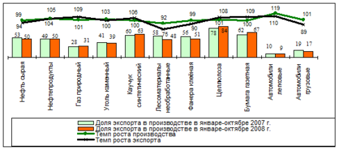 В январе-октябре 2008 г. по сравнению с соответствующим периодом прошлого года увеличилась доля экспорта в совокупных объемах производства нефтепродуктов, газа природного, каучука синтетического, целлюлозы, бумаги газетной в результате увеличения экспорта этих товаров. Экспорт газа вырос вследствие низкой базы прошлого года (мягкая зима 2006–2007 гг. привела к снижению потребления топлива в Европе).
