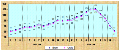 Мировые цены на нефть продолжали определять динамику российского экспорта. В январе-ноябре 2008 г. цена на нефть марки «Urals» составила 99,4 доллара США за баррель. В ноябре цена составила 51,1 доллара США за баррель, снизившись на 43,3% по сравнению с ноябрем 2007 года и на 27,5% к предыдущему месяцу.
