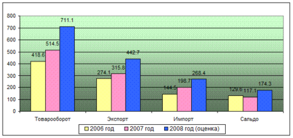 В январе-ноябре 2008 г. внешнеторговый оборот по оценке Минэкономразвития России (по методологии платежного баланса), составил 711,1 млрд. долларов США, увеличившись по сравнению с соответствующим периодом прошлого года на 38,2% (в январе-ноябре 2007 г. – на 22,9 процента). В общем объеме товарооборота на долю экспорта приходилось 62,3%, импорта -37,7 процента. Положительное сальдо торгового баланса составило, по оценке, 174,3 млрд. долларов США.