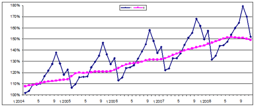 Динамика ВВП с исключением сезонных и календарных факторов (2) и без исключения (1), (январь 1995 (2) -100%)