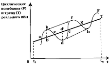 На этом же графике показано фактическое колебание реального ВВП в краткосрочном периоде, без того «сглаживания», которое необходимо для построения графика тренда. Волнообразная линия F показывает колебания деловой активности вокруг линии тренда. Линия F отражает колебания уровня ВВП, вызываемые существованием экономических циклов. Таким образом, следует отличать долгосрочную динамику (тренд) от краткосрочных колебаний деловой активности.