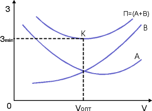 На рис. 2.1 показана зависимость внутрипроизводственных затрат (А), внепроизводственных (В) и полных затрат (П=А+В) от объема выпускаемой продукции. Оптимальный размер предприятия достигается при минимуме полных затрат на выпуск продукции. На рисунке этот минимум обозначен точкой К.