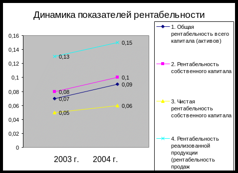 Значение коэффициента абсолютной ликвидности по итогам 2004 года увеличилось на 100%, но не достигло нормы (N> 0,2). Коэффициент критической ликвидности также незначительно возрос с 0,59 до 0,62 при норме (N>1,0). Общее покрытие оборотными активами краткосрочных обязательств (коэффициент текущей ликвидности) увеличилось на 0,04 единицы и составляет 1,06 при (N>2). Коэффициент платёжеспособности возрос с 1,16 до 1,34.