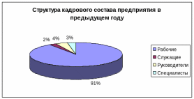 Из представленных выше рисунков видно, что доля рабочих в общем количестве сотрудников предприятия не изменилась, доля служащих увеличилась на 1%, а доля специалистов напротив – снизилась на 1%.