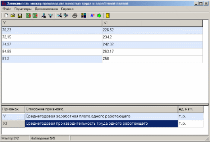 На основе показателей, представленных в таблице, рассчитаем коэффициент корреляции между производительностью труда и средней заработной платой. Для расчета коэффициента корреляции был использован программный продукт Korreg. Данная программа используется для определения зависимости между различными показателями методом корреляционно-регрессионного анализа, она также обладает широкими возможностями по статистической обработки информации. Следует отметить важность компьютеризации такого рода расчетов, приводящей к значительной экономии времени и получении более точных результатов.