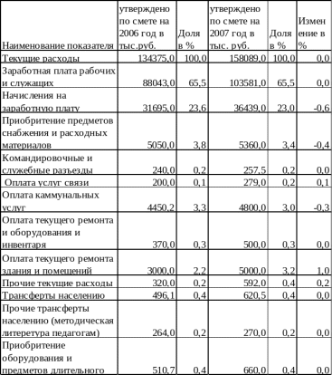 Наибольший удельный вес в расходах организации занимает расходы на заработную плату и начисления на заработную плату 65,5 и 23,6 процентов в 2006 году 65,5 и 23,0 процентов соответственно в 2007 году. Оплата коммунальных услуг и приобретение предметов снабжения, расходных материалов, а также оплата текущего ремонта зданий относятся также к основным расходам учреждения, что обусловлено спецификой бюджетной системы. По оплате за коммунальных услуг и приобретению предметов снабжения наблюдается сокращение расходов на 0,3 и 0,4 процентных пункта соответственно, что связанно с программой энергосбережения и более жесткому контролю со стороны органов казначейства за приобретением. Целенаправленным использованием бюджетных средств выделяемых на покупку предметов снабжения и расходных материалов. По оплате текущего ремонта зданий в 2007 году наблюдается увеличение расходов на 1,0 процентных пункта по сравнении с аналогичным периодом прошлого года.