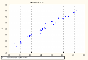 Для вибору форми зв'язку застосуємо раніше побудований графік із зображенням кореляційного поля (графік залежності перемінних Yi і обраної X1). По його вигляду визначаємо, що між даними змінними лінійна форма зв’язку.