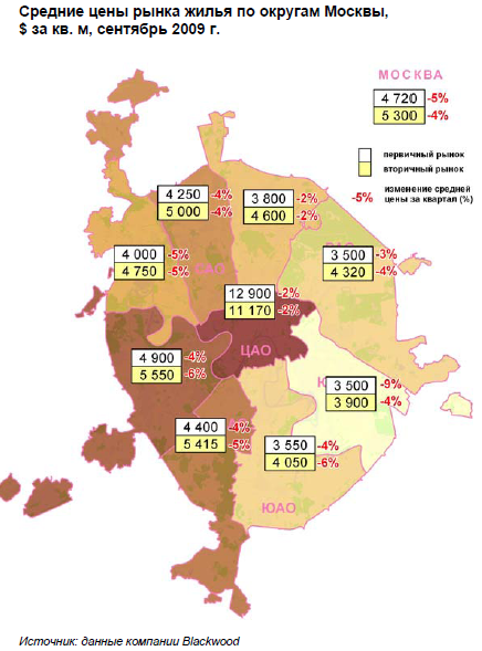Что касается территориального распределения, в 3 квартале 2009 г. традиционно самое дорогое жилье предлагалось в ЦАО: на первичном рынке в среднем по $13 200 за кв. м, на вторичном - $ 11 400 за кв. м. Второе место по стоимости жилья традиционно занимал ЗАО, где в третьем квартале 2009 г. цена квадратного метра на первичном рынке составила $5 100, а на вторичном - $5 900. Относительно невысокими ценами на жилье характеризуются ЮВАО, ВАО и ЮАО. Цены на рынке новостроек здесь находятся в диапазоне $3 700 - 3 850 за кв. м, на вторичном рынке - $4 100 - 4 500 за кв. м.