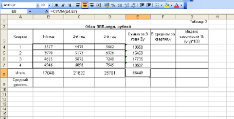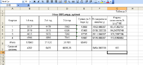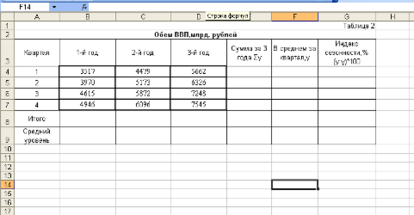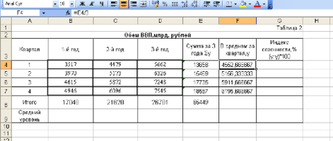 2. Рассчитываем сумму объема ВВП за 3 года по каждому кварталу. Результаты вычислений отражены в табл. №3.
